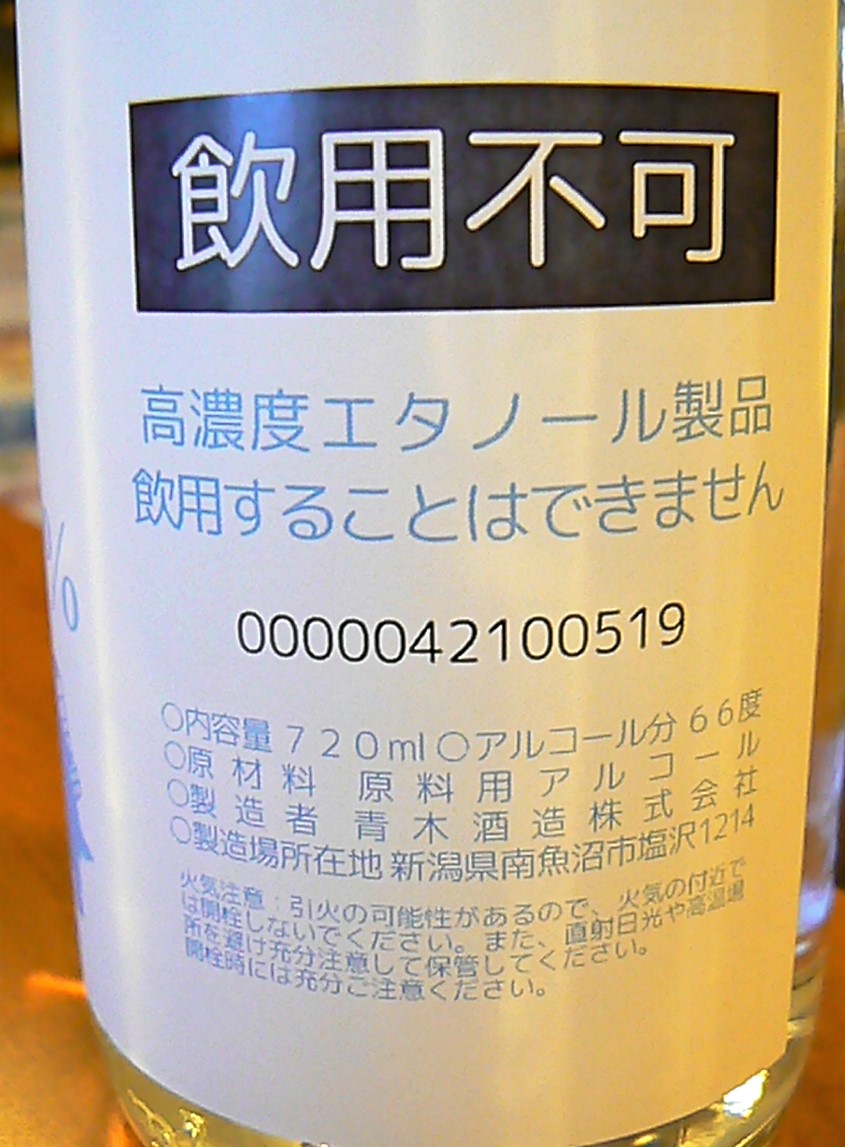 鶴齢手指消毒アルコール注意書き